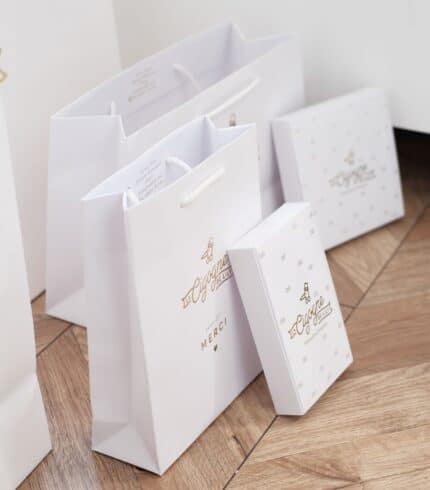 Chaque article est délicatement emballé dans un voile de papier de soie blanc assorti d’un petit message personnalisé.